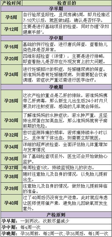 1.孕早期:准妈妈应在10-12周内进行首次正式产检,孕早期尽量减少b超次数,以防对胎儿产生不利影响。(推荐阅读:整个孕期做几次B超好?)