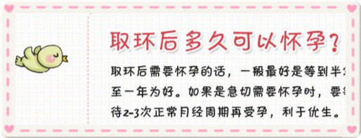 更好是提前半年至一年取环。即使是急切需要怀孕时,也要等待2~3次正常月经周期后再受孕,以便给子宫内膜一个恢复时间,利于优生。