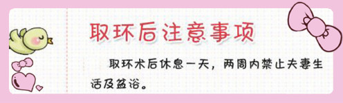温馨提示:取环虽然是个小手术,但也是宫腔内操作,一定要注意环境及技术安全,到正规医院进行。取环前一定要做好妇科检查,以确保无其他炎症病情,同时要在取环前3-5天内禁止同房。