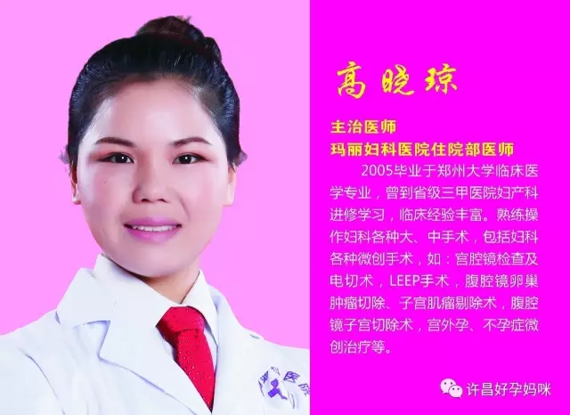 2005毕业于郑州大学临床医学专业,曾到省级三甲医院妇产科进修学习,临床经验丰富。熟练操作妇科各种大、中手术,包括妇科各种微创手术,如:宫腔镜检查及电切术,LEEP手术,腹腔镜卵巢肿瘤切除、子宫肌瘤剔除术,腹腔镜子宫切除术,宫外孕、不孕症微创治疗等。